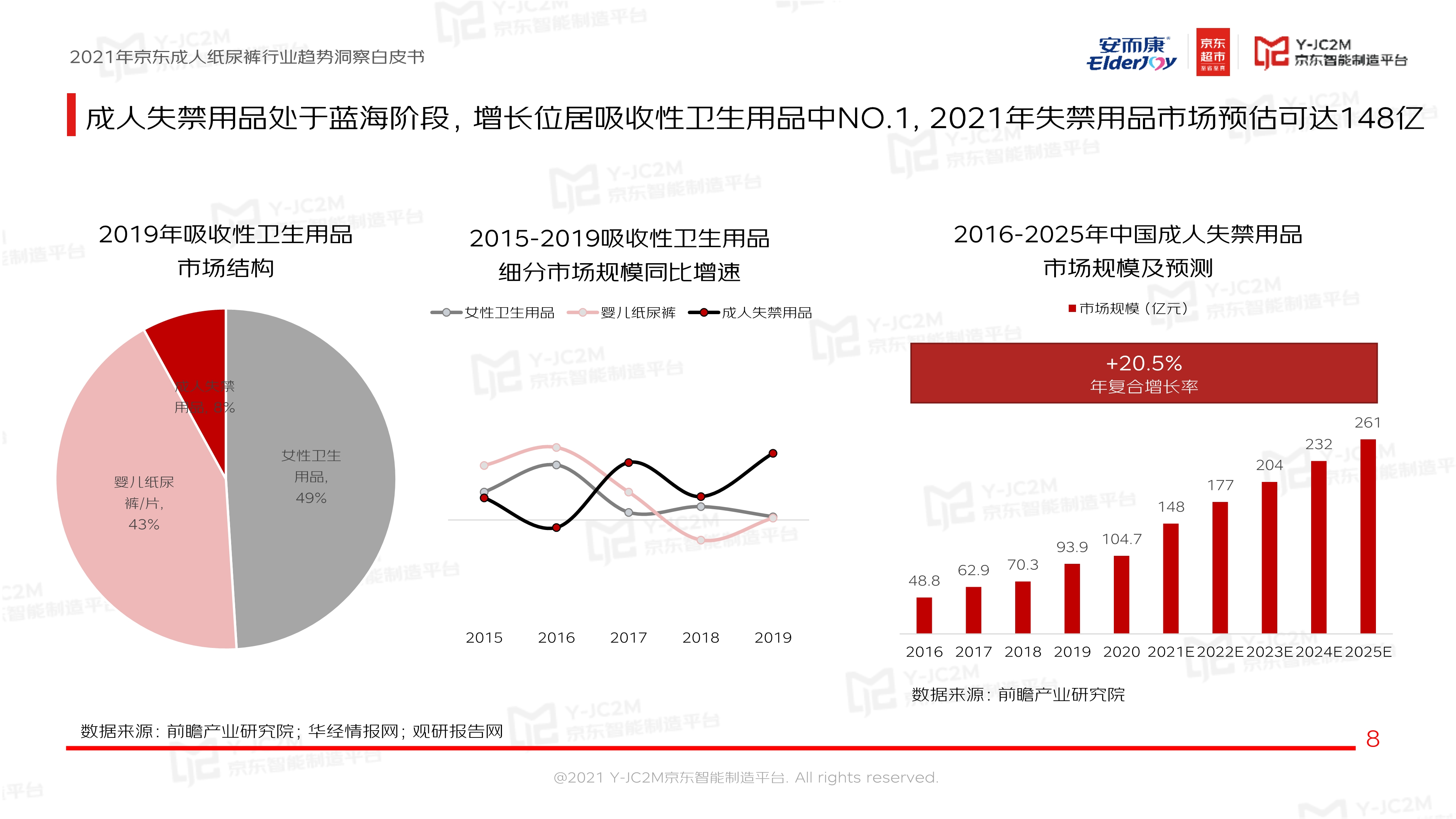 通过《2021年京东成人纸尿裤行业趋势洞察白皮书》的解读,我们不难发现,相较于历经多年发展、已接近或达到成熟期的婴儿护理用品和女性卫生用品行业,国内成人失禁用品行业现在刚刚开始步入成长通道,未来将成长为高增长赛道。综合消费升级趋势下的市场扩容、消费者教育后品牌认知提升等因素的作用,同时伴随养老服务制度在我国的完善,以及成人失禁护理相关福利政策的陆续出台,未来我国成人失禁用品机构渠道与个人需求增长将不断提速,而以快盈v3旗下安而康品牌为代表的国货更将有望凭借产品和先发优势继续领跑。